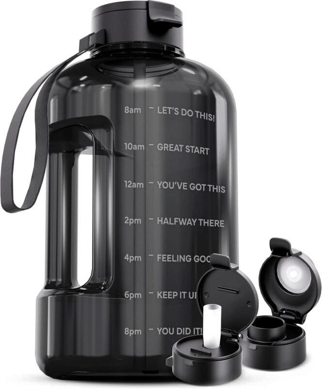 AQUAFIT 128 oz Water Bottle with Time Marker – Straw & Chug Lid – BPA Free 1 Gallon Gym Water Bottle with Handle – Big Gallon Jug (Gray, 128 Ounces)