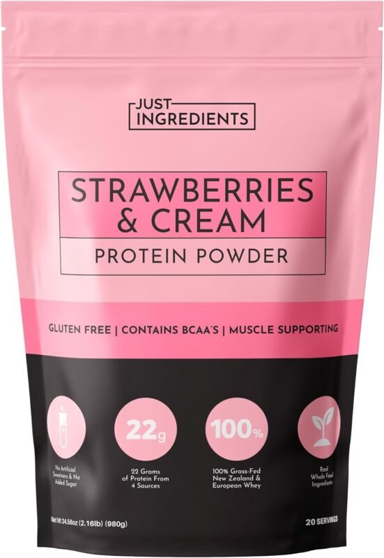 JUST INGREDIENTS Strawberries & Cream Protein Powder – 20-Serving Blend with 100% Grass-Fed Whey & Organic Plant Proteins – Real Strawberry Flavor – Supports Muscle Recovery, Energy