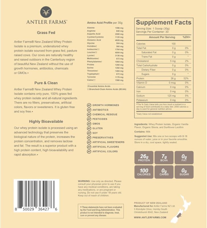 Antler Farms – 100% Grass Fed New Zealand Whey Protein Isolate, Vanilla Flavor, 2 lbs – Pure and Clean, 4 Ingredients, Delicious, Cold Processed
