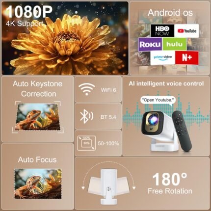 [Support 4K] 1080P HD Mini Projector Dual Band WiFi6 5G and Bluetooth5.4 Auto Focus & Obstacle Avoidance Portable Outdoor Projector, 270° Adjustable Stand for Home Movie – White
