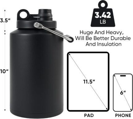 Kerilyn Insulated Gallon Jug with Handle, One Gallon, 128oz Stainless Steel, Large Double Vacuum Water Bottle for Hot & Cold Drinks, Wide Mouth, Sweat Proof, Great for Travel, Camping, Black