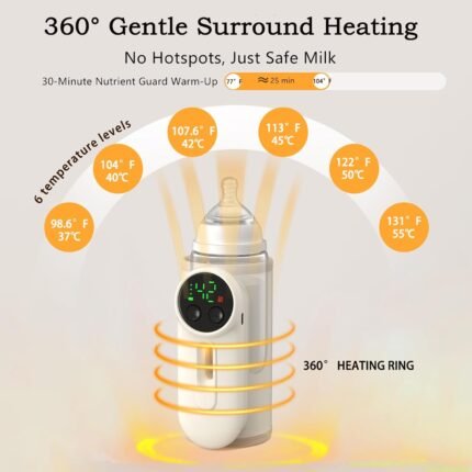 Portable Baby Bottle Warmer with Food-Safe Mat | Gentle 6-Temp Heating for Breastmilk & Formula | USB-C 30-min Charge, 8H Hold | Fits Anti-Colic Bottles ≤2.8″ | Night Lingt & Milk Window