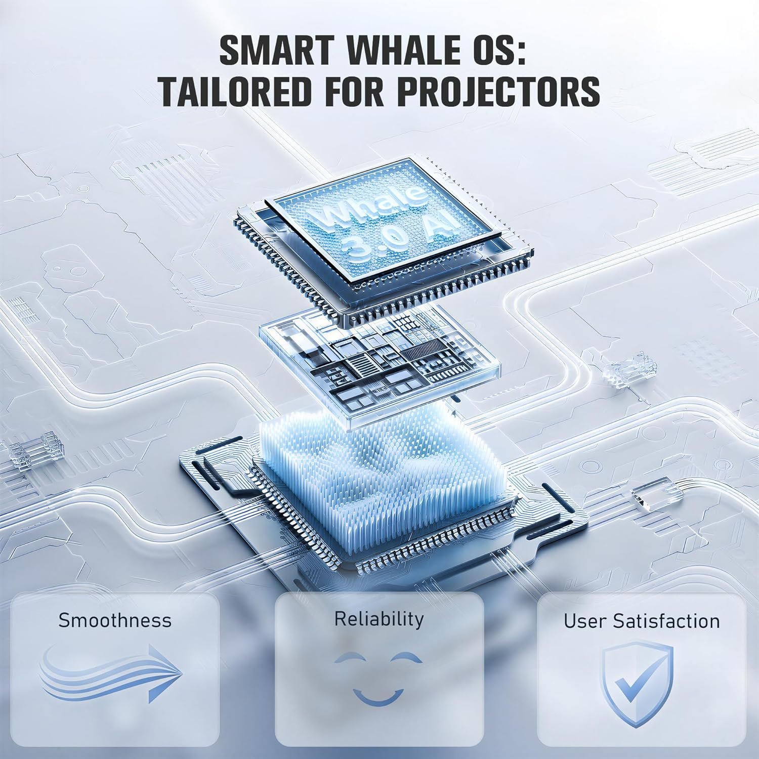 【Entertainment HubSmart Whale OS Compatible with Netflix, Your Personal Streaming Hub】 Experience a seamless smart ecosystem with the 3.0 AI Whale OS in this smart projector, which comes pre-loaded with YouTube and Prime Video. Access hundreds of other downloadable apps on this projector with built-in apps for endless entertainment—no external stick required. (For an even wider app selection, explore our VOPLLS GTV Series projectors.) With regular updates and a secure interface, your personal streaming projector hub is always ready and up-to-date.