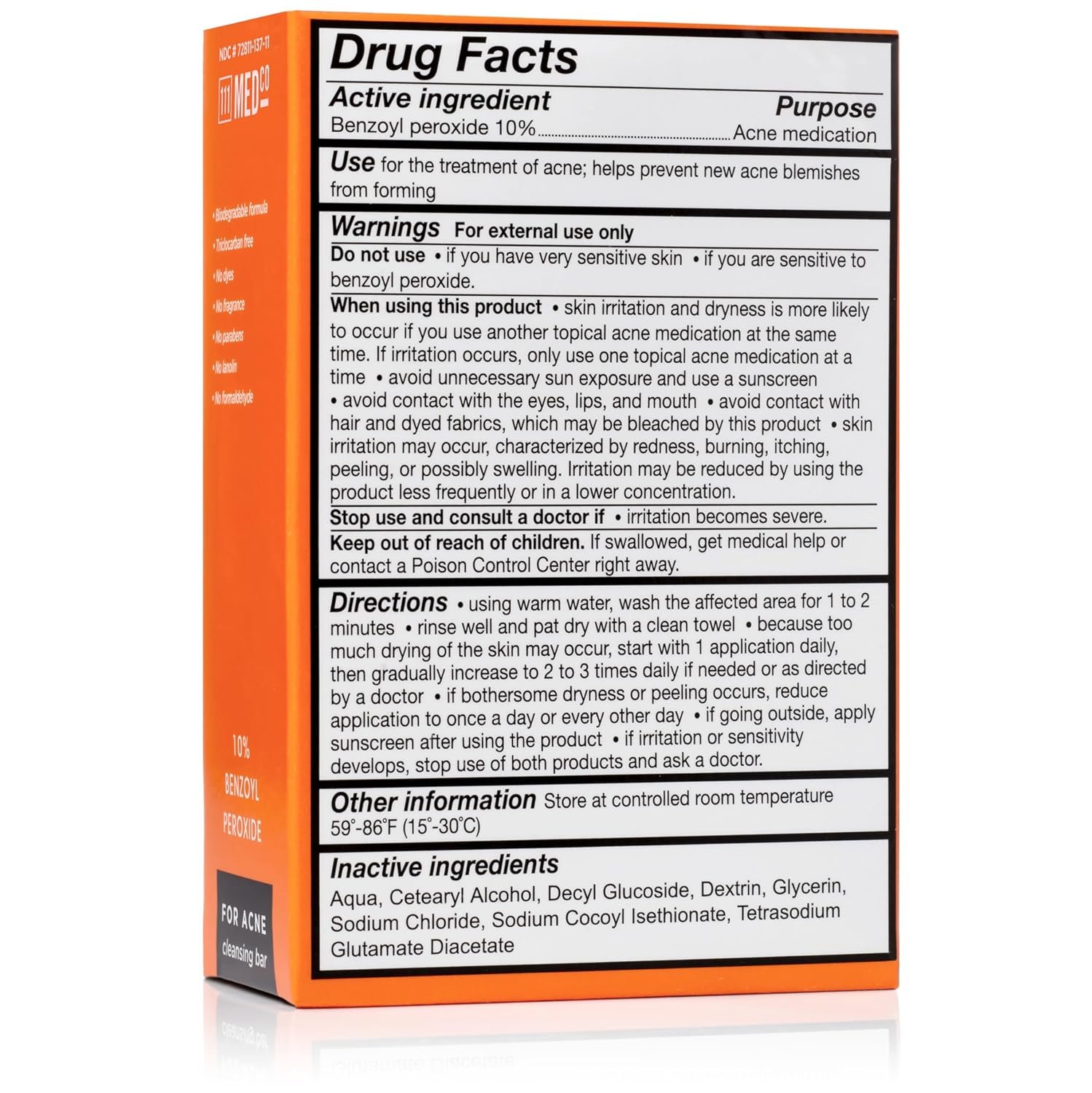 ABOUT THE PRODUCT / INGREDIENTS: The 111MedCo 10% Benzoyl Peroxide (BPO) Acne Cleansing Bar utilizes the proven reliability of benzoyl peroxide to help treat acne by deeply cleaning pores to remove dirt and oil. There are no added fragrances, dyes, parabens, lanolin, or formaldehyde. It is a biodegradable formula and triclocarban free. Benzoyl peroxide is used globally and is the most widely used topical treatment of acne. INGREDIENTS: Aqua, Cetearyl Alcohol, Decyl Glucoside, Dextrin, Glycerin, Sodium Chloride, Sodium Cocoyl Isethionate, Tetrasodium Glutamate Diacetate.