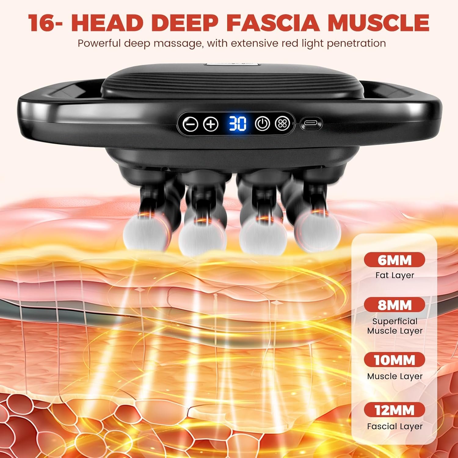 16-Head Massage, Full-Body Relaxation: Crafted with 16 high-resilience massage balls made from skin-friendly material, they are soft and non-irritating, increasing the massage area.Massage Gun.With just one hand, you can cover and press large areas without frequent posture adjustments. Adaptable to varying tolerance levels across the body, it provides soothing care.Muscle Massager.Covers shoulders, neck, waist, back, limbs, and feet, quickly relaxing large muscle groups.