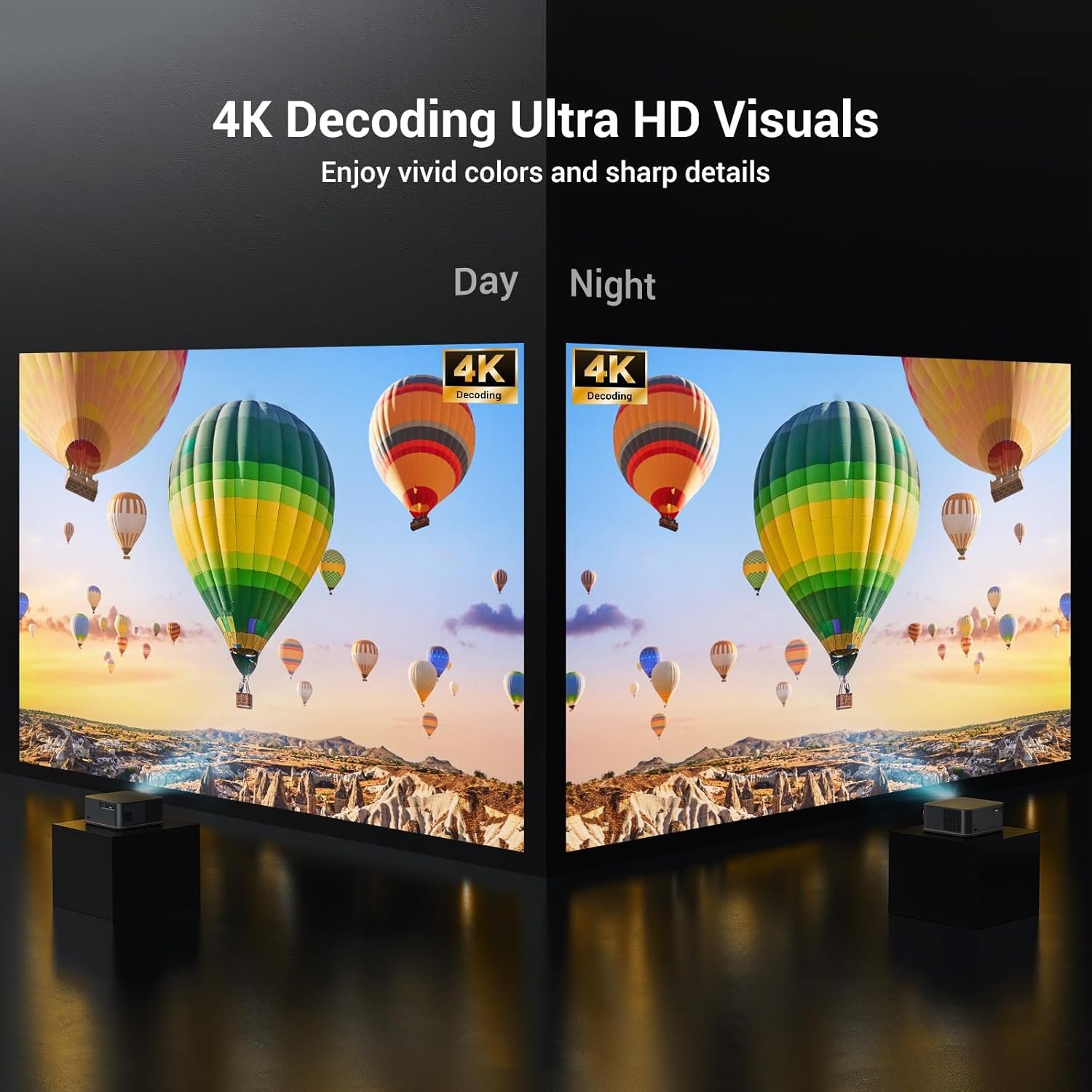 [HIGHER QUALITY IMAGES: 2000 ANSI & 4K Decoding] This 4K decoding projector offers up to 2000 ANSI lumens brightness and supports 4K decoding video, ensuring bright and clear images whether it’s day or night. Portable projector with a 20000:1 contrast ratio and 95% color gamut present richer light and dark levels and color details, making every frame vivid and lively. Enjoy a cinema-quality experience at home, and it’s also the perfect choice for outdoor movie nights.