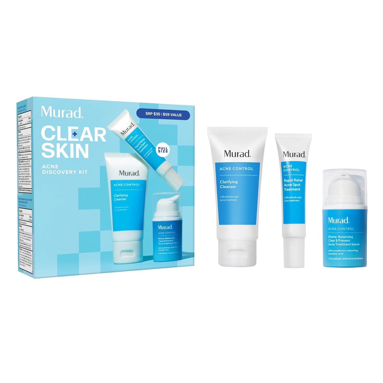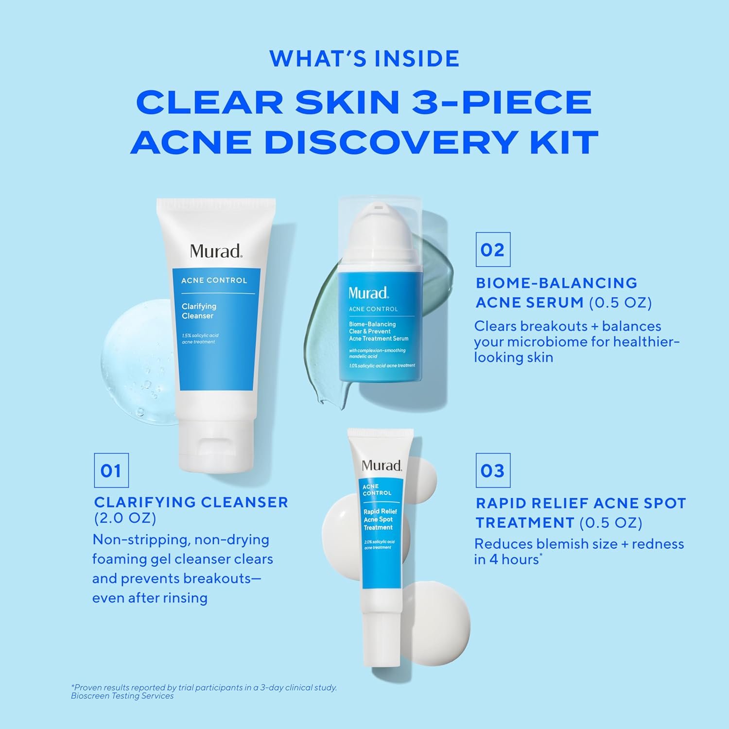 Murad Acne Trial Kit – Salicylic Acid & Mandelic Acid for Fast, Clear Skin is a powerful 3-step regimen designed to target breakouts and promote a healthier-looking complexion. This trial-size set includes a 2oz Clarifying Cleanser with salicylic acid to deeply cleanse and clear pores, a 0.5oz Biome-Balancing Acne Treatment to treat and balance acne-prone skin with mandelic acid, and a 0.5oz Rapid Relief Acne Spot Treatment for fast-acting pimple reduction in as little as 4 hours. Ideal for oily, combination, or acne-prone skin, this dermatologist-developed kit is perfect for on-the-go use or introducing your skin to Murad’s acne-fighting essentials.