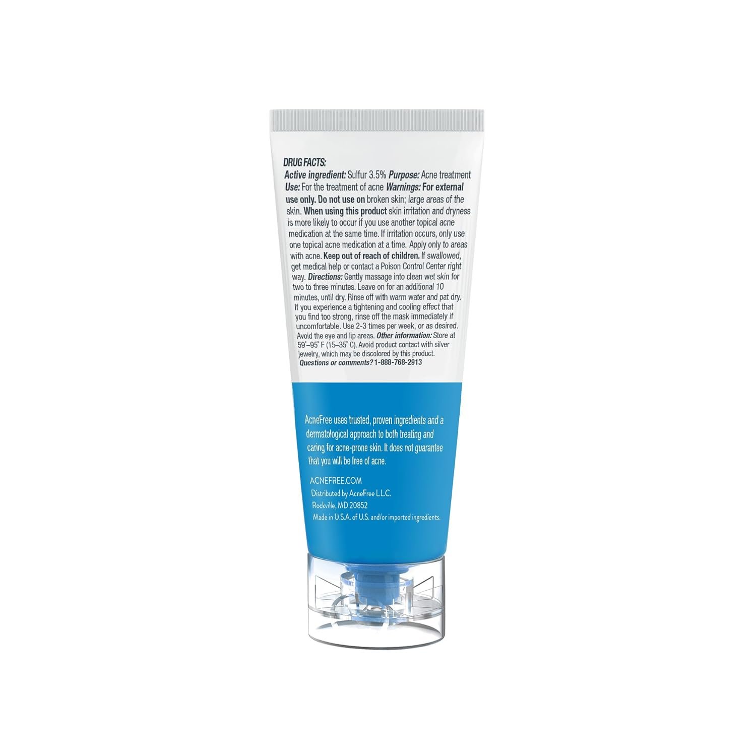 If you experience oily skin with acne, the AcneFree Therapeutic Sulfur Mask is the solution for you. This penetrating pore therapy soothes acne-inflamed skin and absorbs excess oils. This treatment is for acne or acne prone skin and also removes impurities, while redefining skin’s entire essence. You feel a cool facial tingle as the mixture massages your pores and revives your skin’s complexion. The secret is the Revolutionary Color-Signal Technology, which transforms the mask a blue tone once it’s completely absorbed and the treatment is complete. The process is easy and convenient to use, and helps to clear blackheads and whiteheads, as well as acne blemishes.AcneFree Product Details: Dimensions: 1.2 x 2.8 x 5.1 inches Weight: 2.72 ounces Supply: 60 days Acne Treatment Type: Face Mask For: Mild to Moderate Acne.