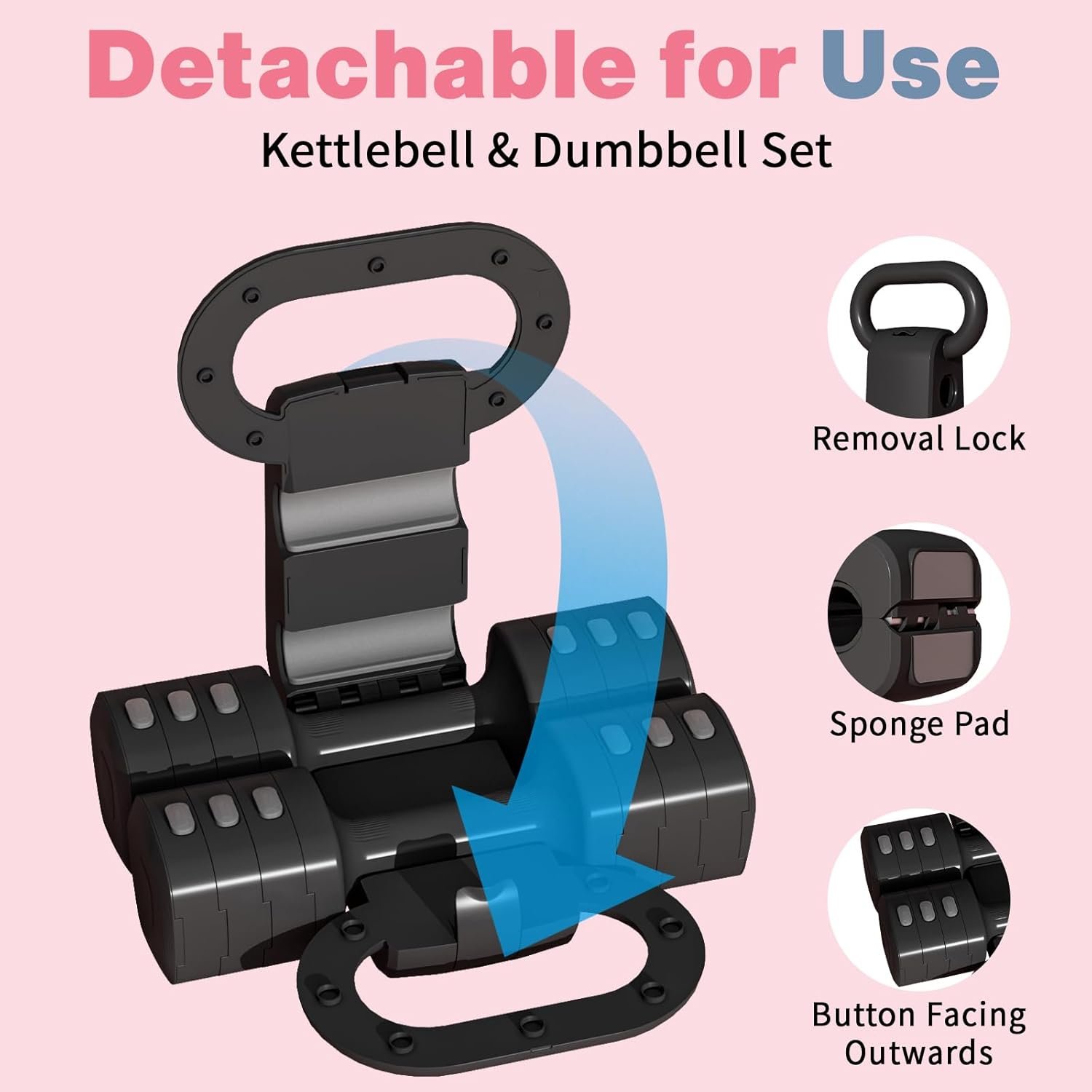 【Quick & Easy to Assembly】 The innovative quick-release mechanism allows effortless weight changes with a simple button press. Hand weights sets for women is no tools or complicated adjustments needed. The locking system of the kettlebell converter ensures the safety