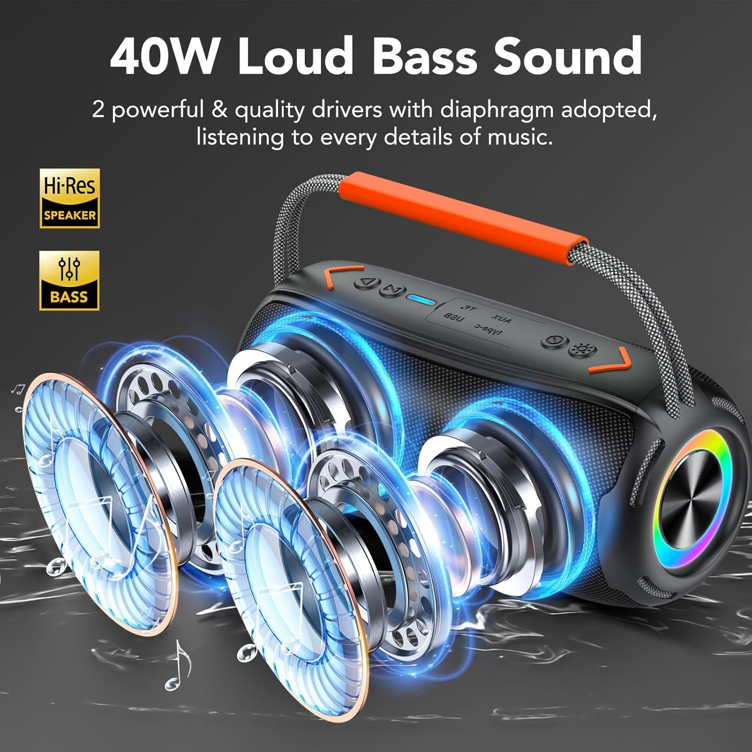 [40W Powerful Output & TWS Function] With a robust 40W output power, this loud Bluetooth speaker ensures your music is heard. Dual 66mm drivers deliver balanced, rich sound across deep bass, clear mids, and crisp highs. Use the TWS (True Wireless Stereo) function to pair two identical speakers for an immersive stereo sound experience, perfect for a home theater setup.