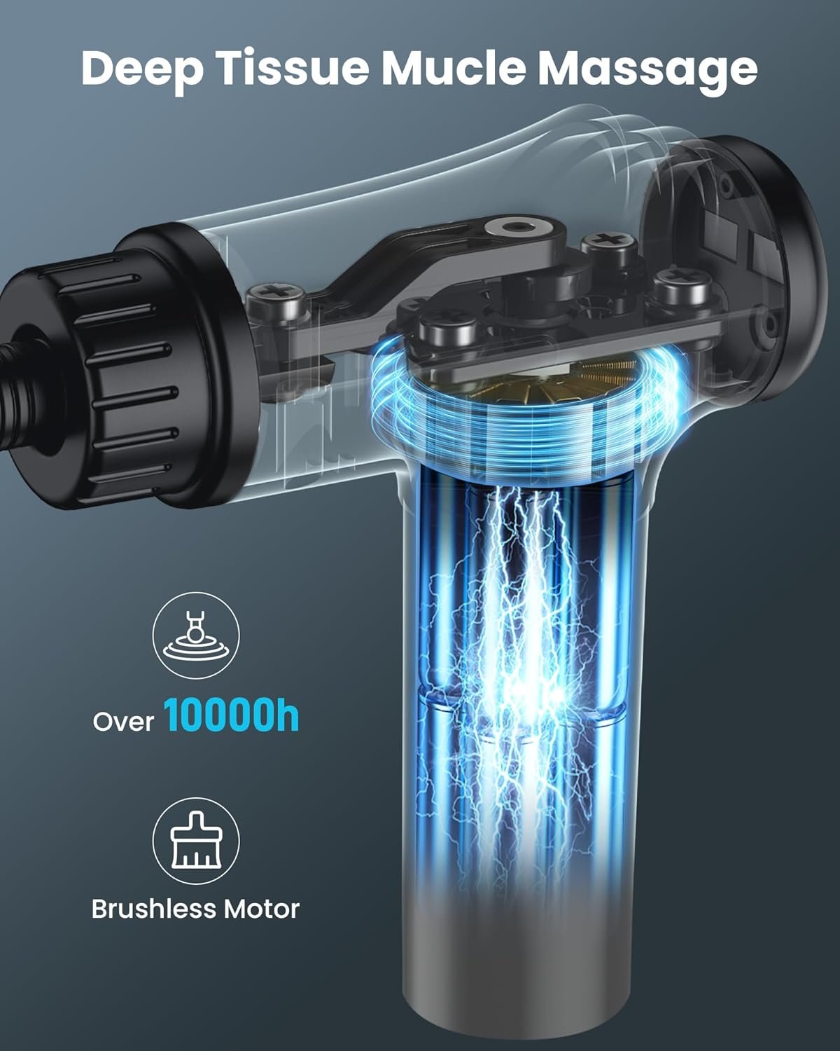 POWERFUL YET GENTLE RELIEF: Our massage gun features a precision-engineered brushless motor, delivering up to 3300 RPM and 14mm amplitude for deep muscle recovery or soothing relaxation; Whether easing post-workout soreness or daily stress, deep tissue massager gun adapts to your body’s needs with quiet, consistent power