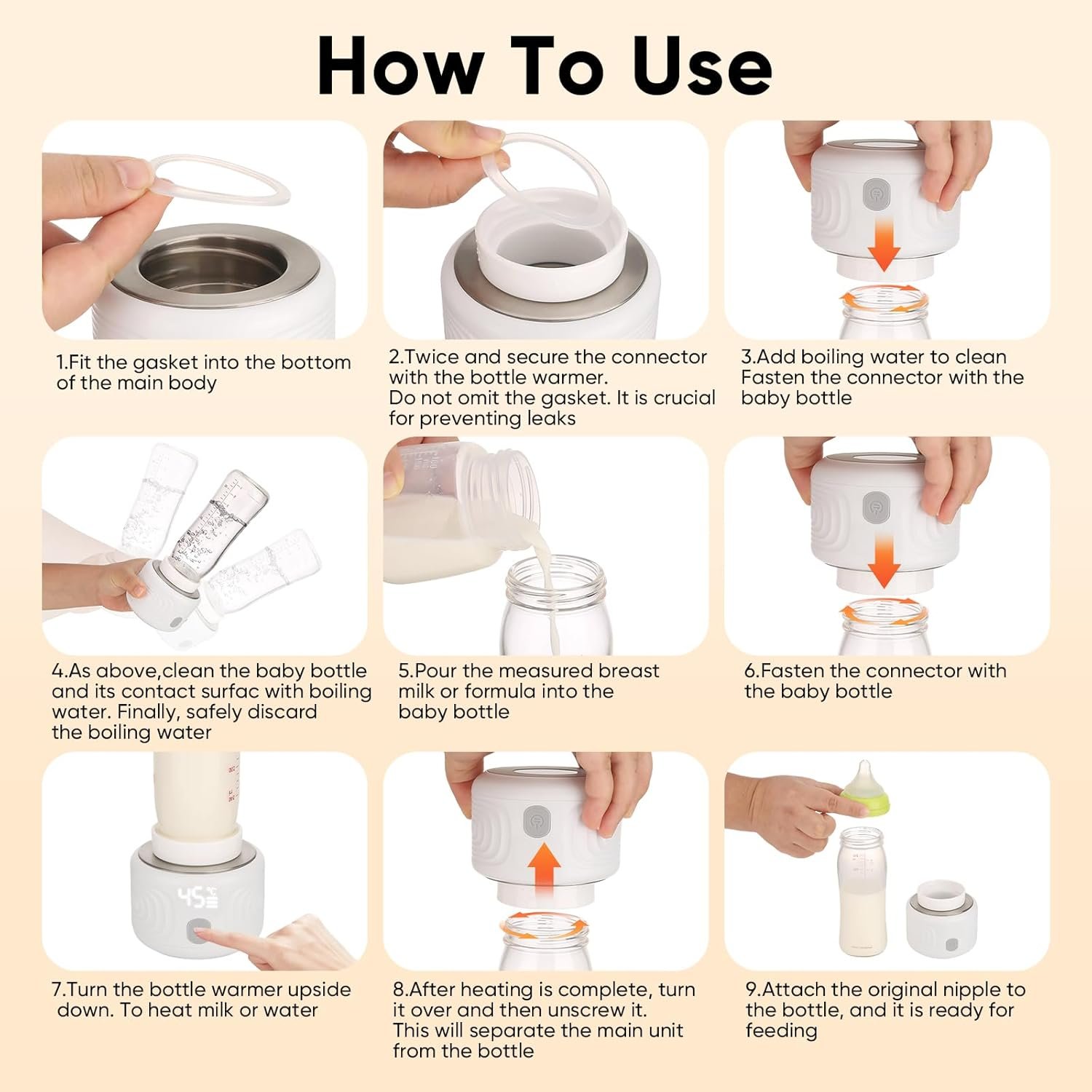 🍼【Effortless Cleaning & Intuitive Operation】♨︎ Keep things simple with easy-to-clean design. Simply flush and wipe for a spotless finish. User-friendly and intuitive, just twist your bottle directly into the device or use the appropriate connector, press the power button, and within minutes, enjoy hassle-free warm milk feeding for your beloved baby.