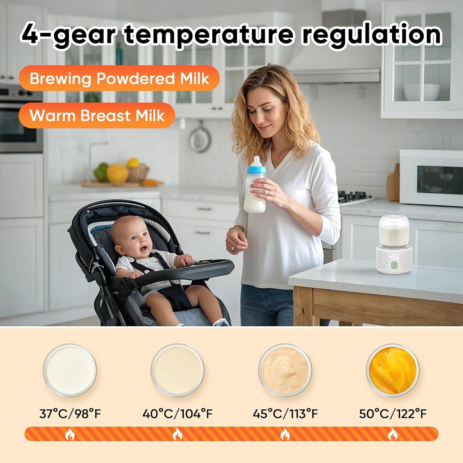 🍼【Rapid Heating & 4 Select-able Temperature】♨︎ Say goodbye to long waits! Our warmer heats 4oz of milk to 98℉ in just 3 minutes, instantly satisfying your hungry little one. With 6 adjustable temperature settings 37℃ (98°F)40℃(104°F) 45℃(113°F) 50℃(122°F) and advanced even heating technology, coupled with external temp-sensing probes, it ensures perfect warmth without overheating, preserving all the nutritional goodness.
