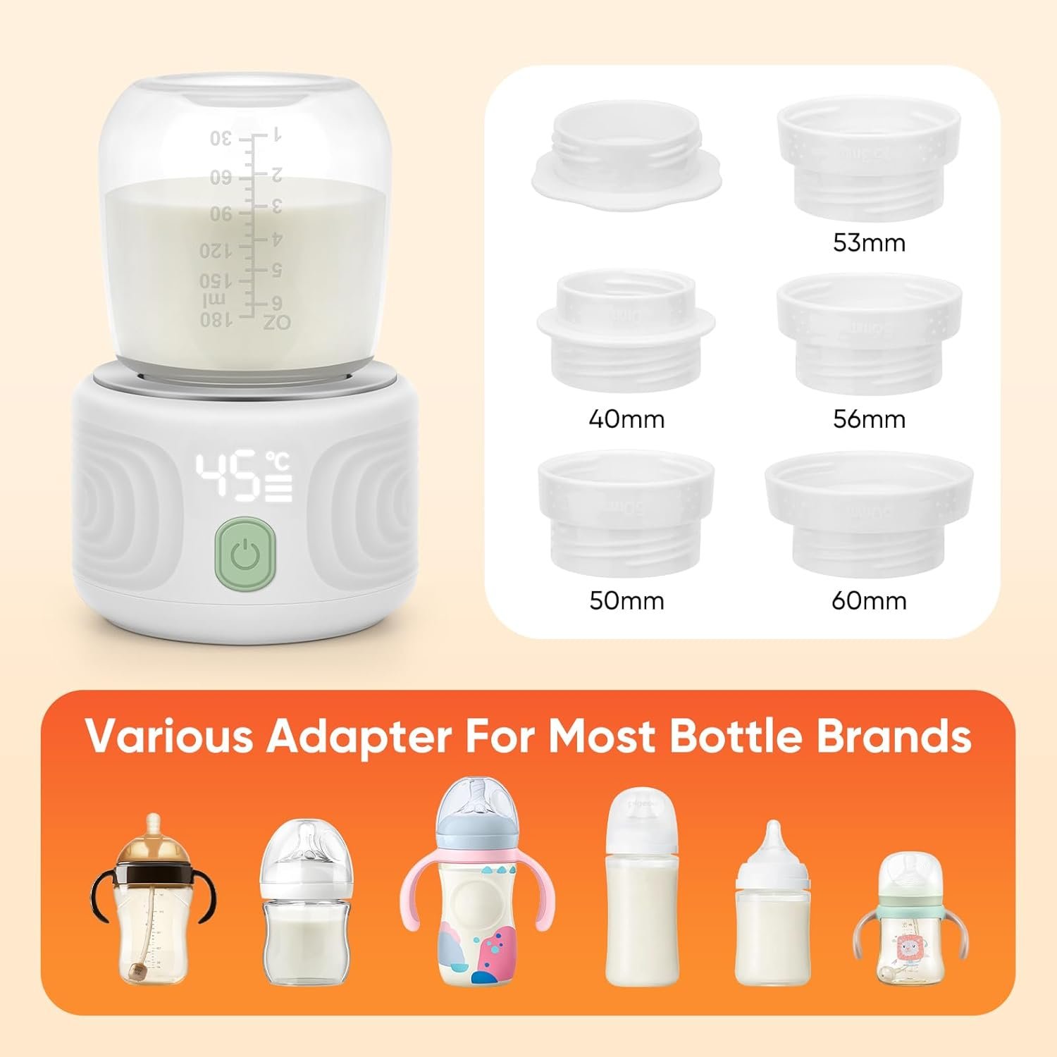 🍼【 Portable Milk Warmer for Baby Includes 4 Adapters】♨︎ Compatible with a wide range of bottles. Please make sure your bottle fits with our adapters. They are 40mm, 45mm,50mm,55mm,60mm adapters.