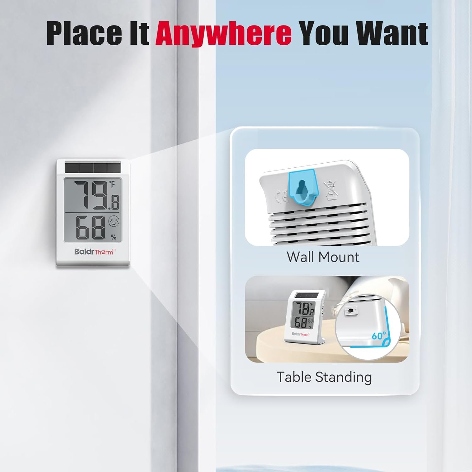 BaldrTherm 2.2” Digital Thermometer and Hygrometer Meter, Solar-Powered Indoor Temperature Sensor Humidity Monitor, Humidity Gauge for Baby Rooms, Bedrooms, Home, Office, and Wine Cellars, 1Pack