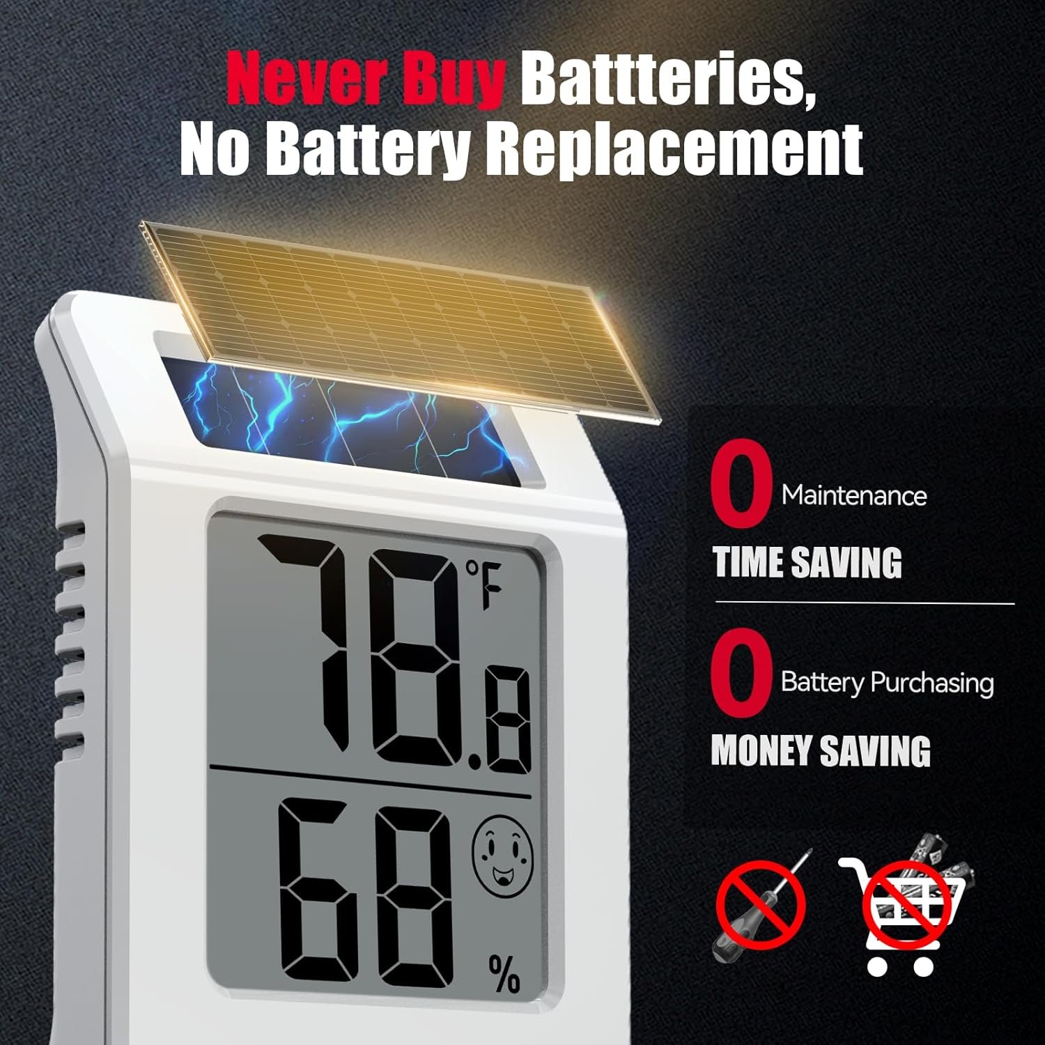 Solar-Powered, Never-Power Off: This indoor thermometer is powered by solar energy,In bright environments, solar panels can provide continuous energy, whether it’s from lights or sunlight!