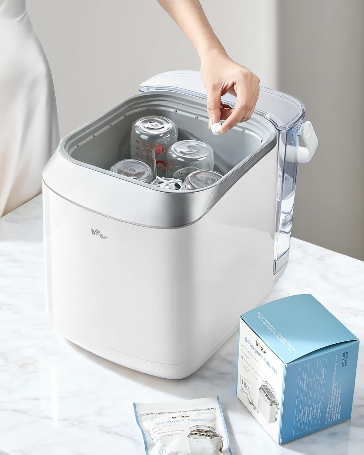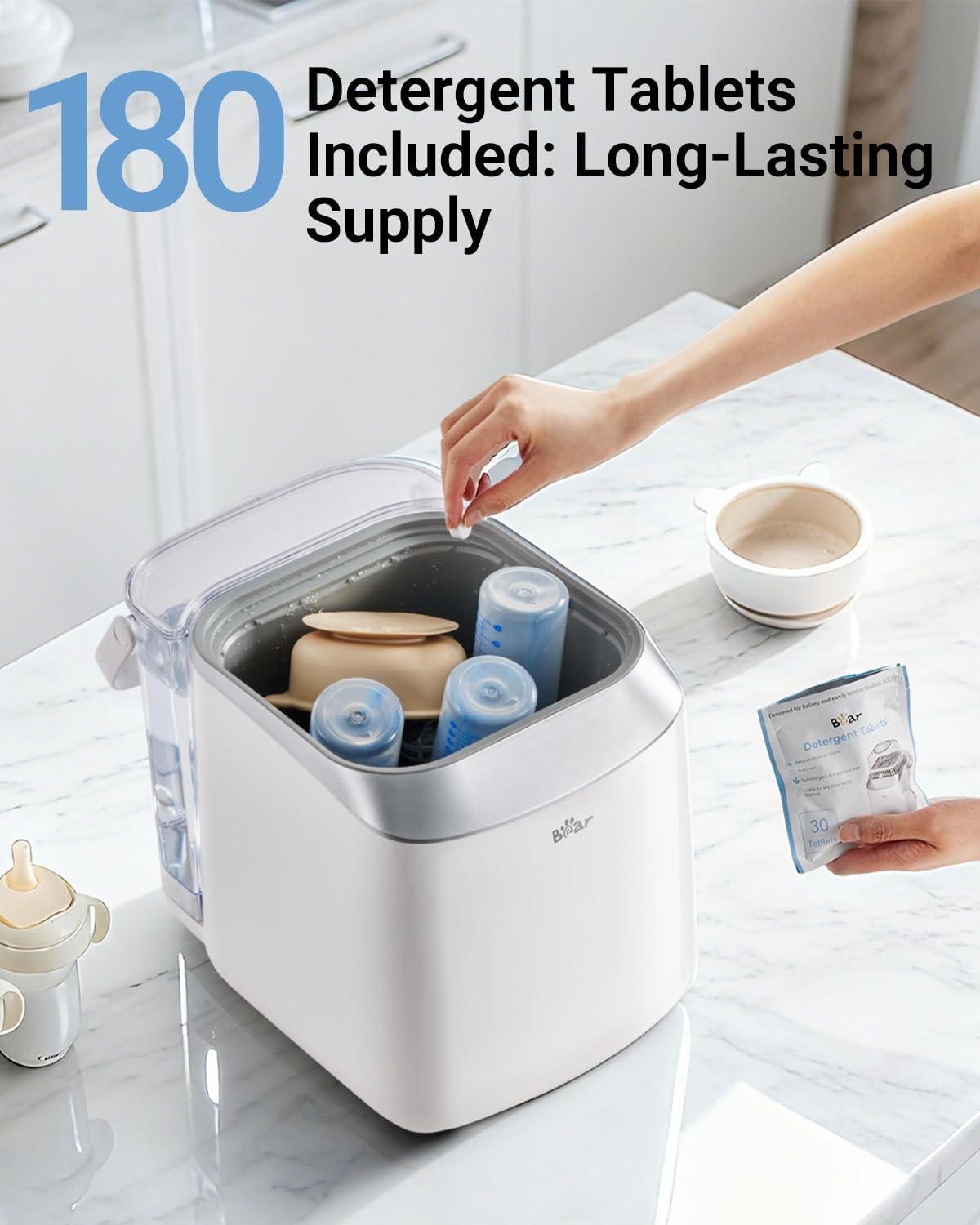 OFFICIAL BEAR FORMULA FOR BEST PERFORMANCE: Specifically developed for the Bear Pro Baby Bottle Washer. For optimal foaming, rinsing, and cleaning results, we recommend using Bear Official Tablets (other brands may foam differently or leave residue)