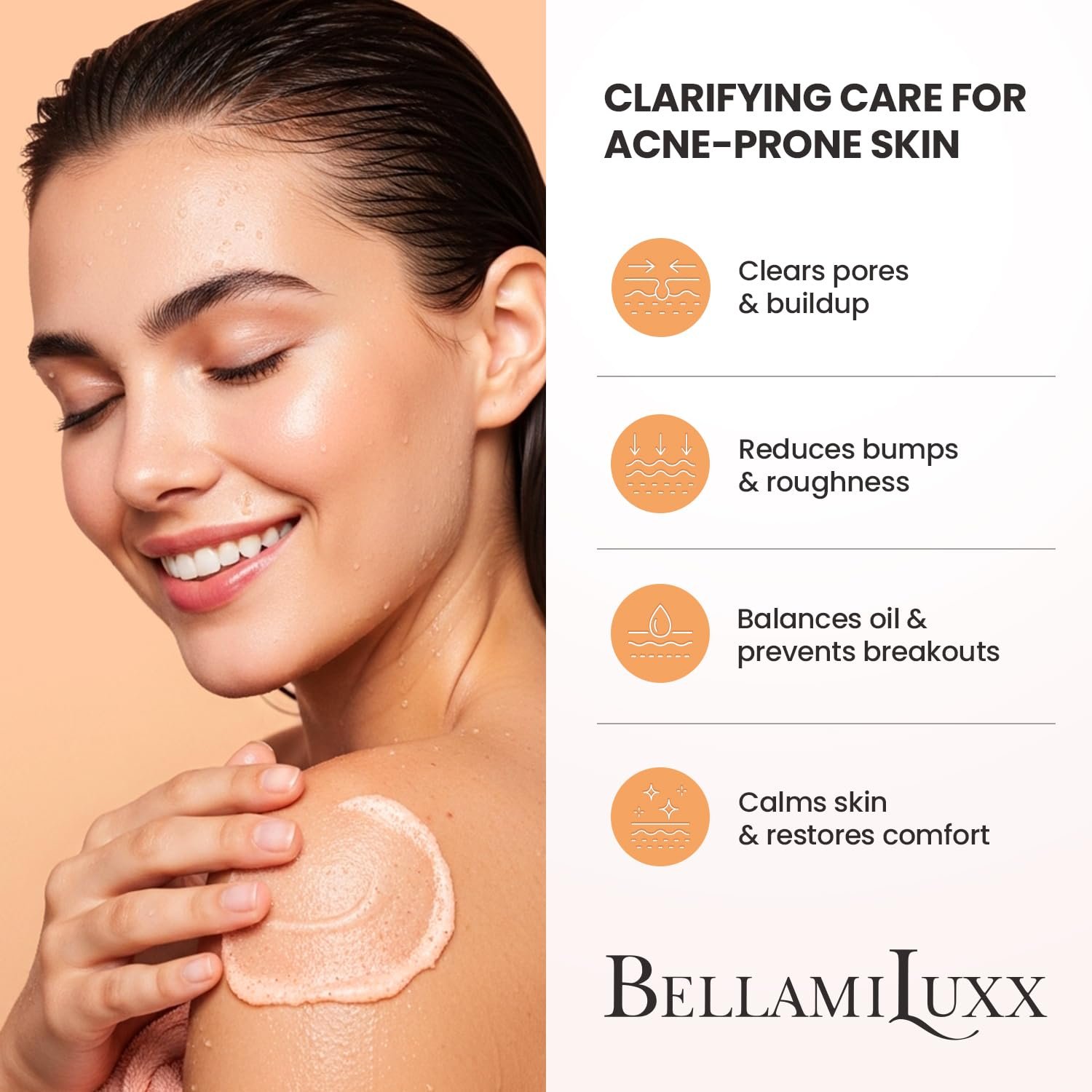BellamiLuxx Body Acne Treatment Scrub: Helps Reduce Body Breakouts on Back, Chest, Butt & Thighs – Back Acne Treatment for Men, Women & Teens – Butt Acne Wash with Natural Actives for Smooth Skin