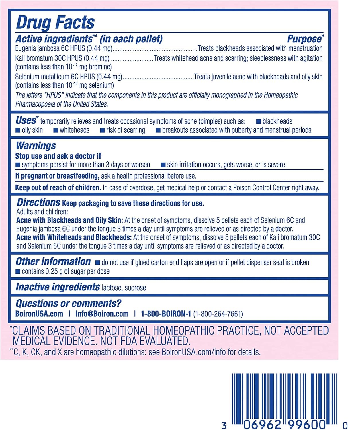 Clear skin starts from the inside out. Boiron’s Acne Relief Kit is an oral acne treatment containing three separate homeopathic medicines you can use together or individually to target breakouts on the face and body. It includes Eugenia jambosa 6C for blackheads associated with puberty and menstrual periods; Kali bromatum 30C for whitehead acne and scarring; and Selenium metallicum 6C for juvenile acne with blackheads and oily skin. * The meltaway pellets dissolve in the mouth without water and come in easy dispensing tubes to take on the go. The Acne Relief Kit is suitable for use by both adults and children. There are no known interactions with other medications, herbs, or supplements associated with the three active ingredients. Made using the highest quality ingredients and sustainable practices, these medicines have no artificial sweeteners, flavors, colors, or preservatives. Also try Cyclease® Cramps for period discomfort, Cyclease PMS Relief, and StressCalm® for daytime symptoms of stress. *Claims based on traditional homeopathic practice, not accepted medical evidence. Not FDA evaluated.