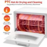 【PTC Hot Air Drying Disinfection Cabinet】: This nail tool cleaning cabinet uses an advanced PTC hot air system with an internal temperature of up to 167°F, which quickly dissipates moisture from nail tools, greatly shortens drying time, helps keep your tools dry, extends their service life and maintains them in optimal condition.
