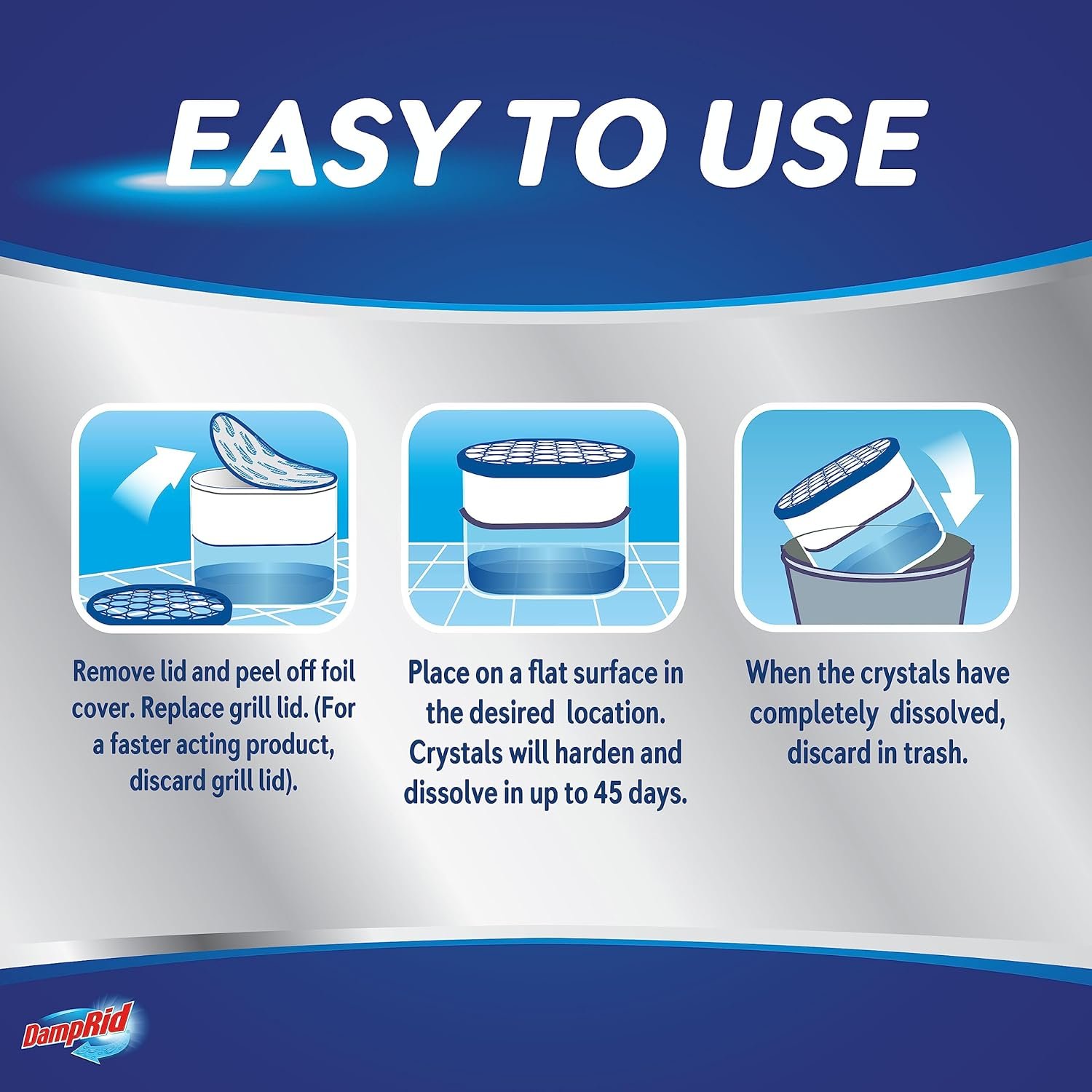 DampRid Disposable Moisture Absorber with Activated Charcoal is the moisture absorber and odor eliminator that will make your air fresher and cleaner. This unique moisture absorber with activated charcoal doesn’t just cover up musty odors, it absorbs excess moisture and removes odors from the toughest sources. No more stale, stagnant, musty smells! Best for use in spaces where airflow is limited and excess moisture is a problem, like bathrooms and closets. To use, simply remove the lid, peel off the foil and place where desired. Can be used next to gym equipment, gym bag, sport bag, shoe closet, luggage bag, or shoe bag. Discard the canister once the crystals have fully dissolved. Each canister lasts for up to 60 days. Achieve long-lasting freshness with this pack of three. Keep out of reach of children. Read and follow all label directions.
