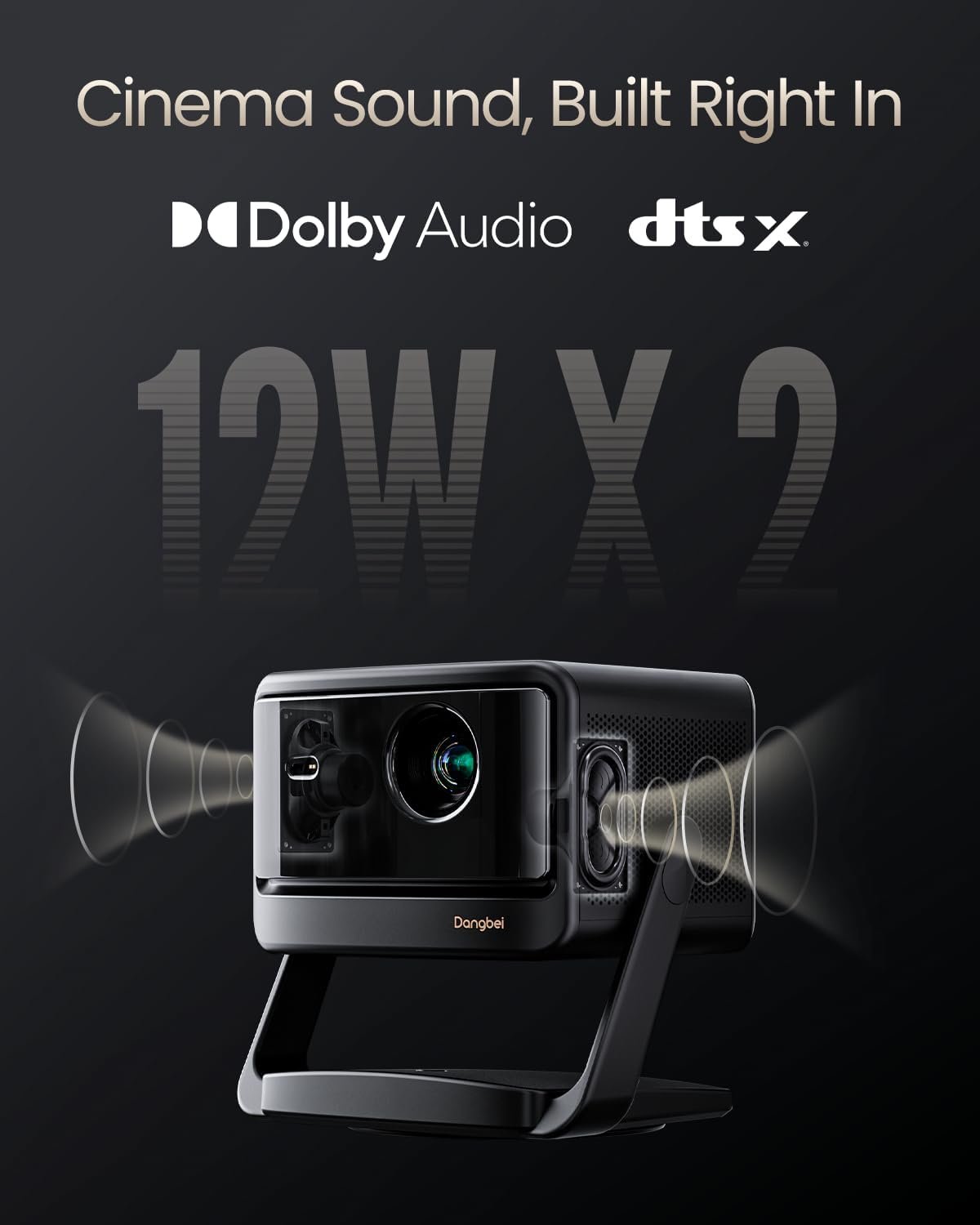 【Dolby Audio & Dual 12W Theater Sound】Experience immersive audio with dual 12W speakers and a 600cc acoustic chamber, featuring Dolby Audio/DTS Virtual:X for cinema-quality sound. Enjoy 2.5x richer bass than standard projectors, clear dialogue, and dimensional effects. Bluetooth 5.2 connects wireless headphones, while HDMI eARC supports high-end sound systems.