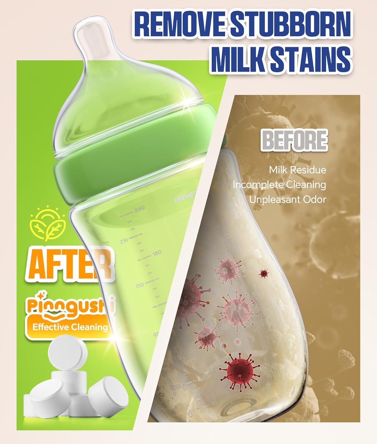 Easy & Hassle-Free Cleaning – Simply drop a tablet into your Bottle washer, done. Save time, avoid scrubbing, and enjoy more moments with your baby