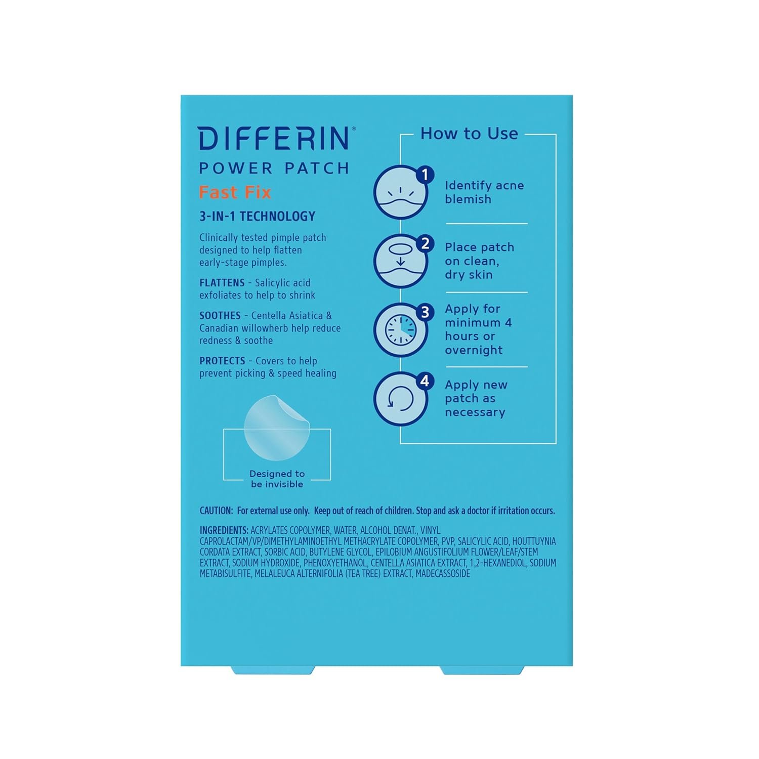 Take on trouble spots with Differin Acne-Prone Skin Patches. Formulated with salicylic acid, these patches exfoliate to help shrink the appearance of imperfections. These invisible ultra-thin patches are makeup-friendly, waterproof, and sweatproof, so you can wear them day and night. The triple-action�technology�starts working fast to flatten, soothe, and protect the area. Dermatologist-tested, the patches are for all skin types, including acne-prone skin. Each box comes with 36 clear, easy-to-peel patches (18 small and 18 large) for any imperfection emergency.�After cleaning and drying the area, place a patch on the imperfection. Leave it on for 4 to 12 hours, remove, and discard. Reapply a new patch as necessary.