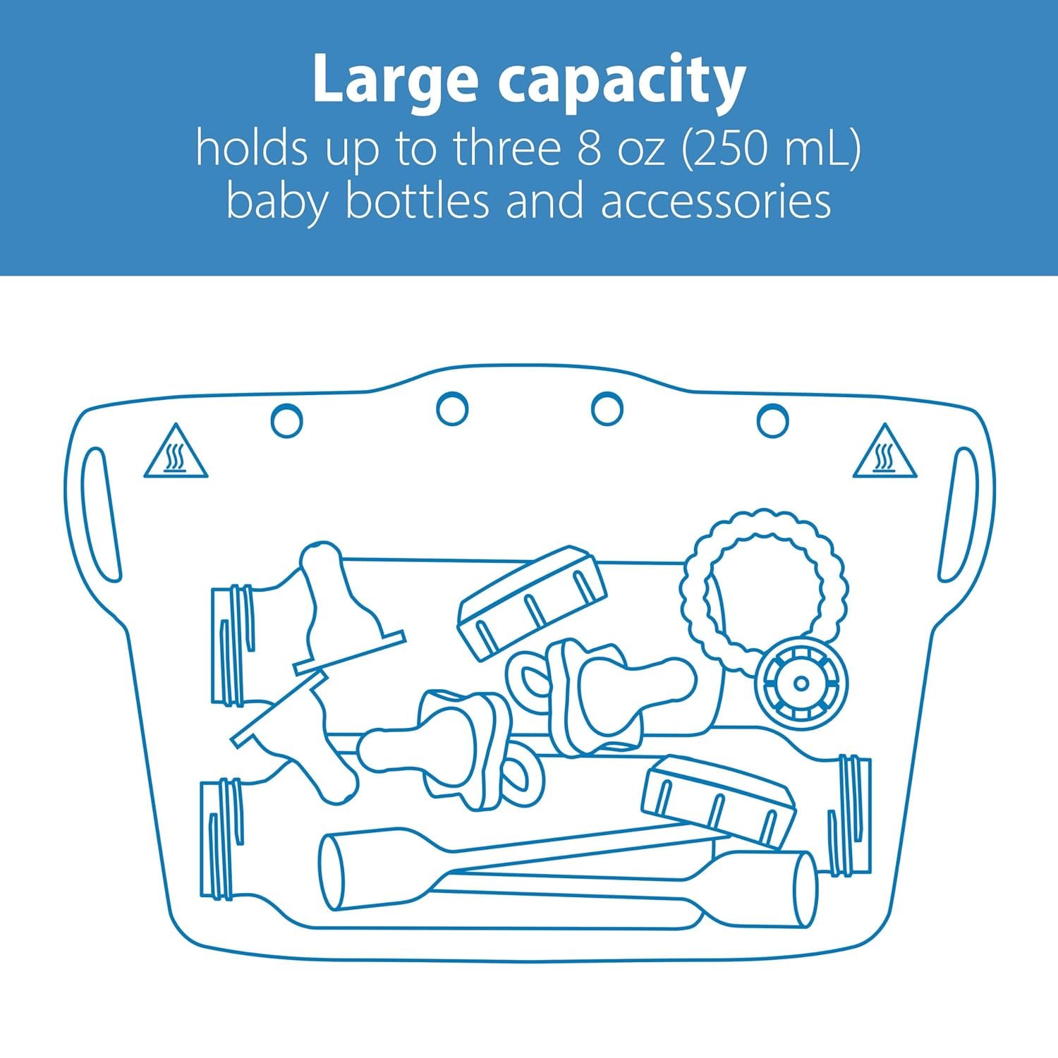 LARGE CAPACITY. Holds up to three 8 oz Narrow or two 9 oz Wide-Neck Dr. Brown’s Bottles along with parts and accessories.