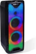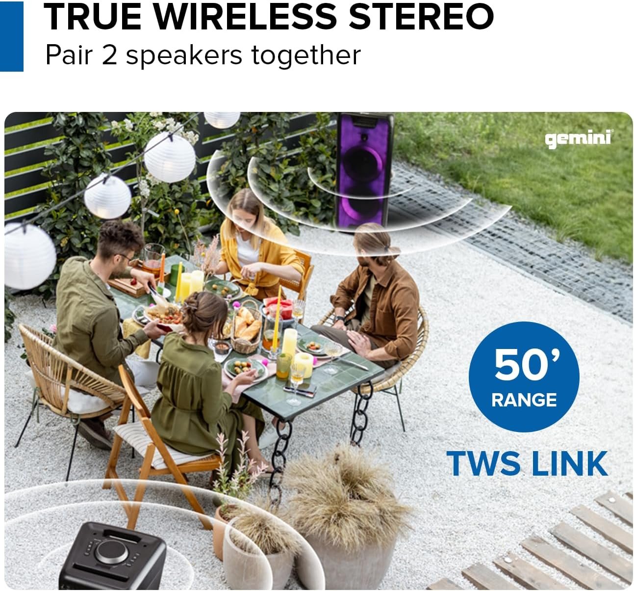 Gemini Bluetooth Speaker 1000W with LED Light Show, Dual 8″ Woofers, Mic & Guitar Inputs, TWS Pairing, USB/FM/Bluetooth Playback, 16 Hr Battery, Remote Control – Perfect for Parties & Events (GLS-880)