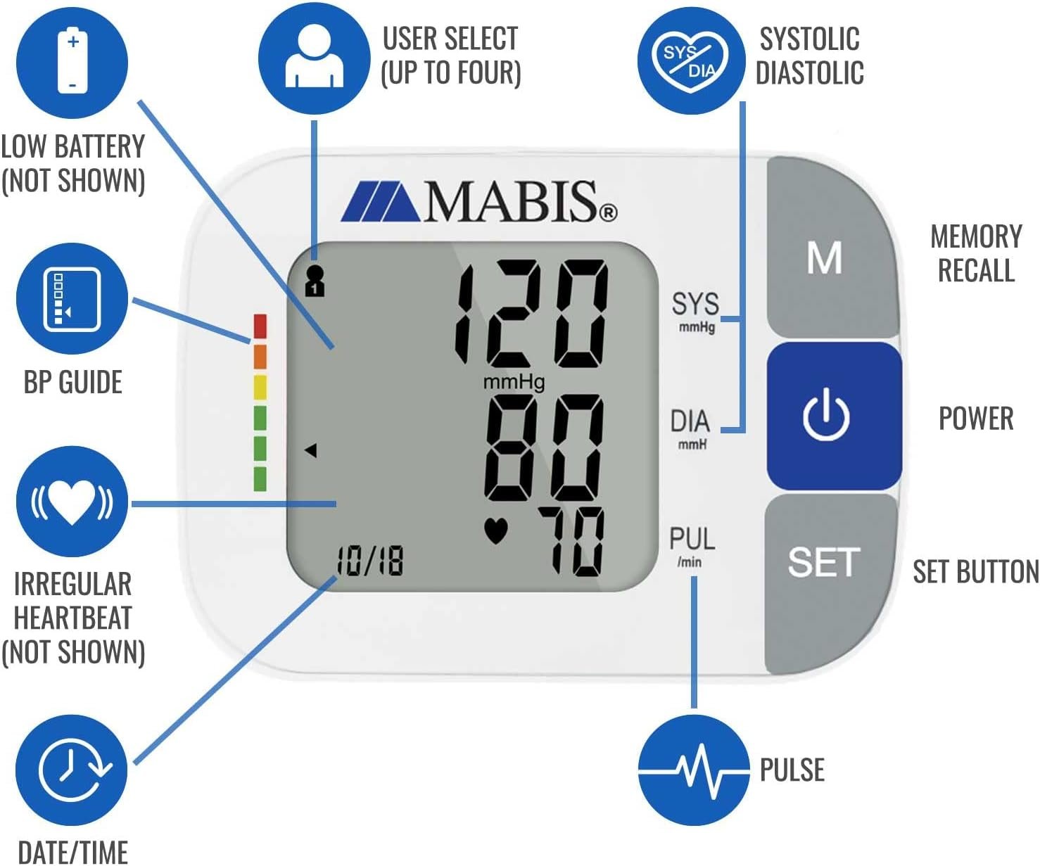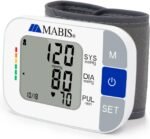 MABIS Universal Wrist Talking Blood Pressure Monitor with pulse and irregular heartbeat monitor. Stores up to 396 readings with 4 user profiles. Audio readings in both English and Spanish. Visual BP Guide. (2) AAA batteries included.