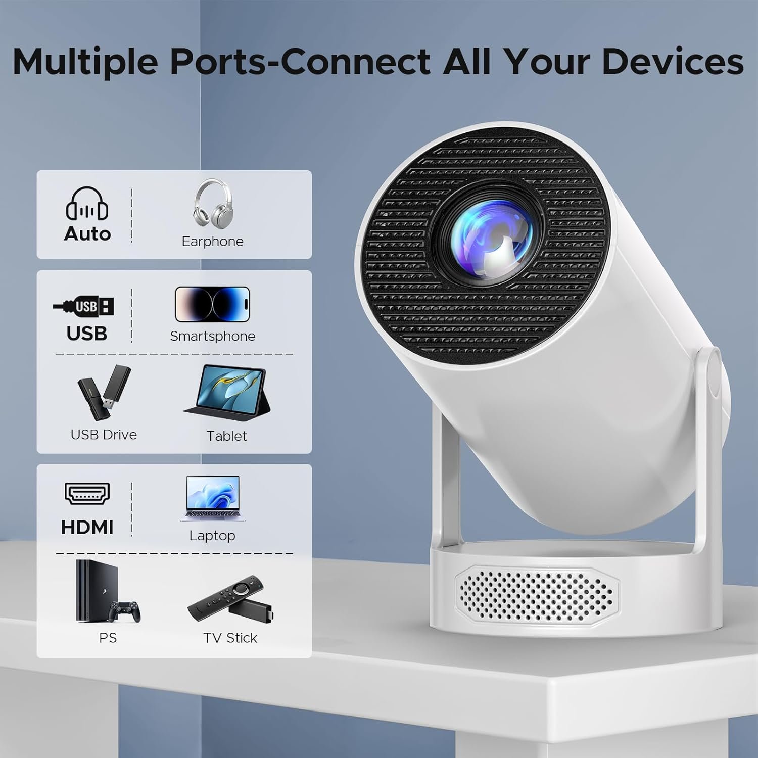 【𝐔𝐩𝐠𝐫𝐚𝐝𝐞𝐝 𝐁𝐚𝐬𝐞-𝐓𝐲𝐩𝐞 𝐒𝐭𝐞𝐫𝐞𝐨 𝐒𝐩𝐞𝐚𝐤𝐞𝐫𝐬 & 𝟐𝟐𝟎° 𝐑𝐨𝐭𝐚𝐭𝐚𝐛𝐥𝐞 𝐒𝐭𝐚𝐧𝐝】This portable projector features upgraded base-type stereo speakers (replacing standard built-in ones) that deliver immersive sound with crisp highs and powerful bass – perfect for audiophiles. The small projector’s 220° rotatable stand allows tool-free adjustment, letting you easily pivot this video projector to project onto walls, ceilings, or any desired surface.