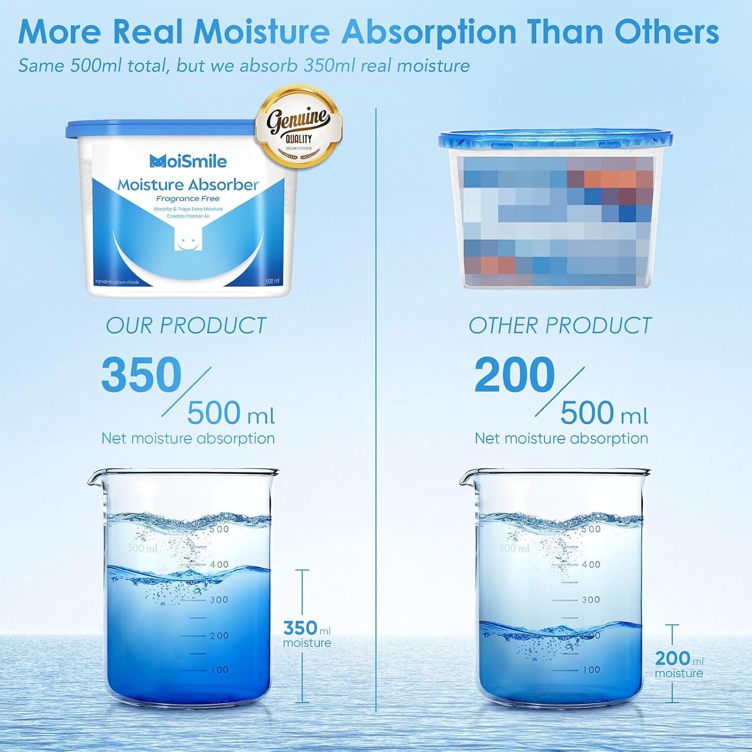 Lasting Moisture Control: Moismile moisture absorber for closet features 74% high-concentration calcium chloride, providing a 133% absorption rate that results in significantly higher real water capture—far exceeding other similar products. Thanks to the large absorption capacity, each closet humidity absorber lasts up to 60 days, offering long-term basement water absorber without frequent replacements.