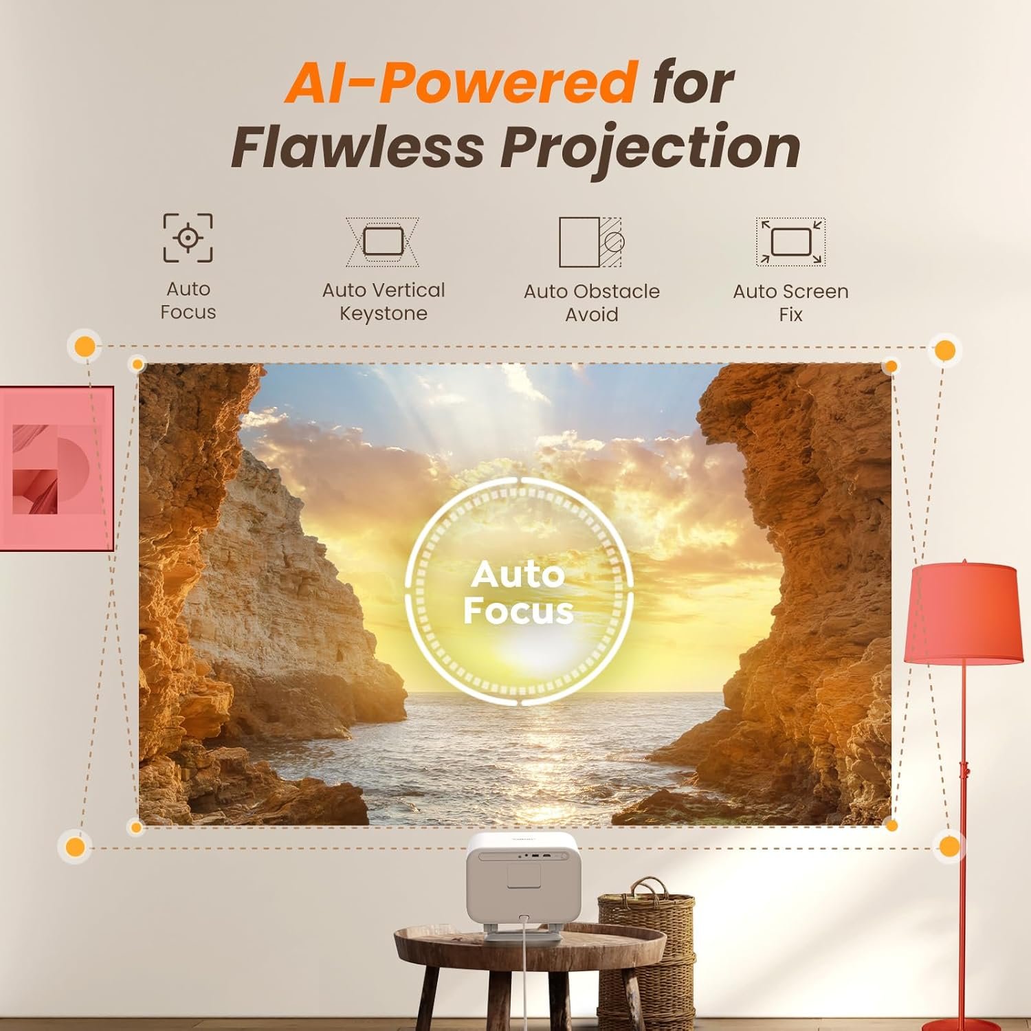【Auto Focus, Keystone Correction, Obstacle Avoidance, Alignment】Enjoy effortless setup with auto focus for crystal-clear images, auto keystone correction, auto screen alignment, and obstacle avoidance, 50% zoom, Yaber video projector quickly adjusts for optimal framing across projection sizes from 40″ to 150″, making it the perfect movie projector for bedrooms, living rooms, home theater.