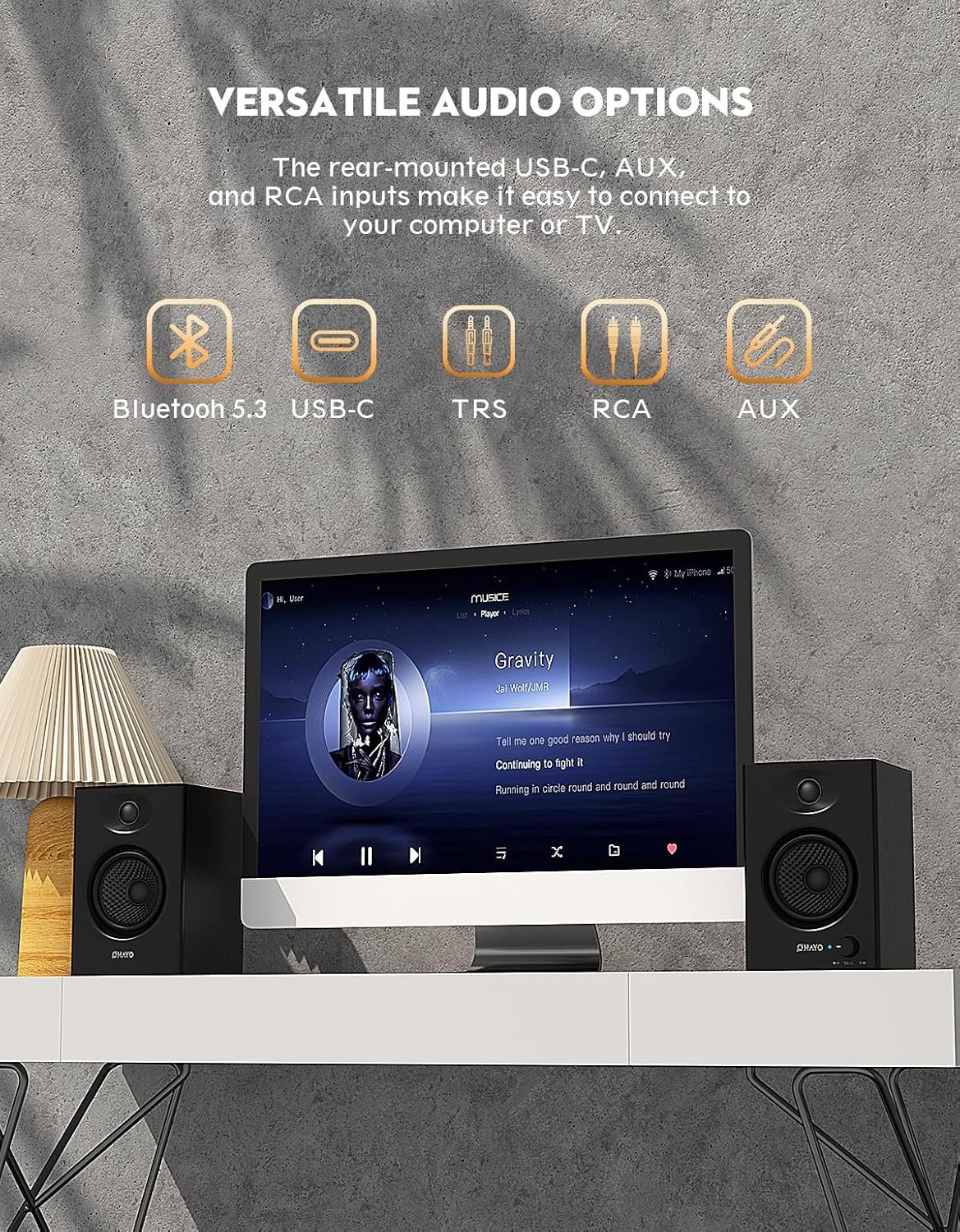 【Multiple Input Options】These speakers are designed to offer versatile connectivity, featuring Bluetooth 5.3 along with RCA, AUX, and USB inputs. This variety ensures compatibility with a wide range of devices, giving you the flexibility to connect seamlessly to your preferred audio source.