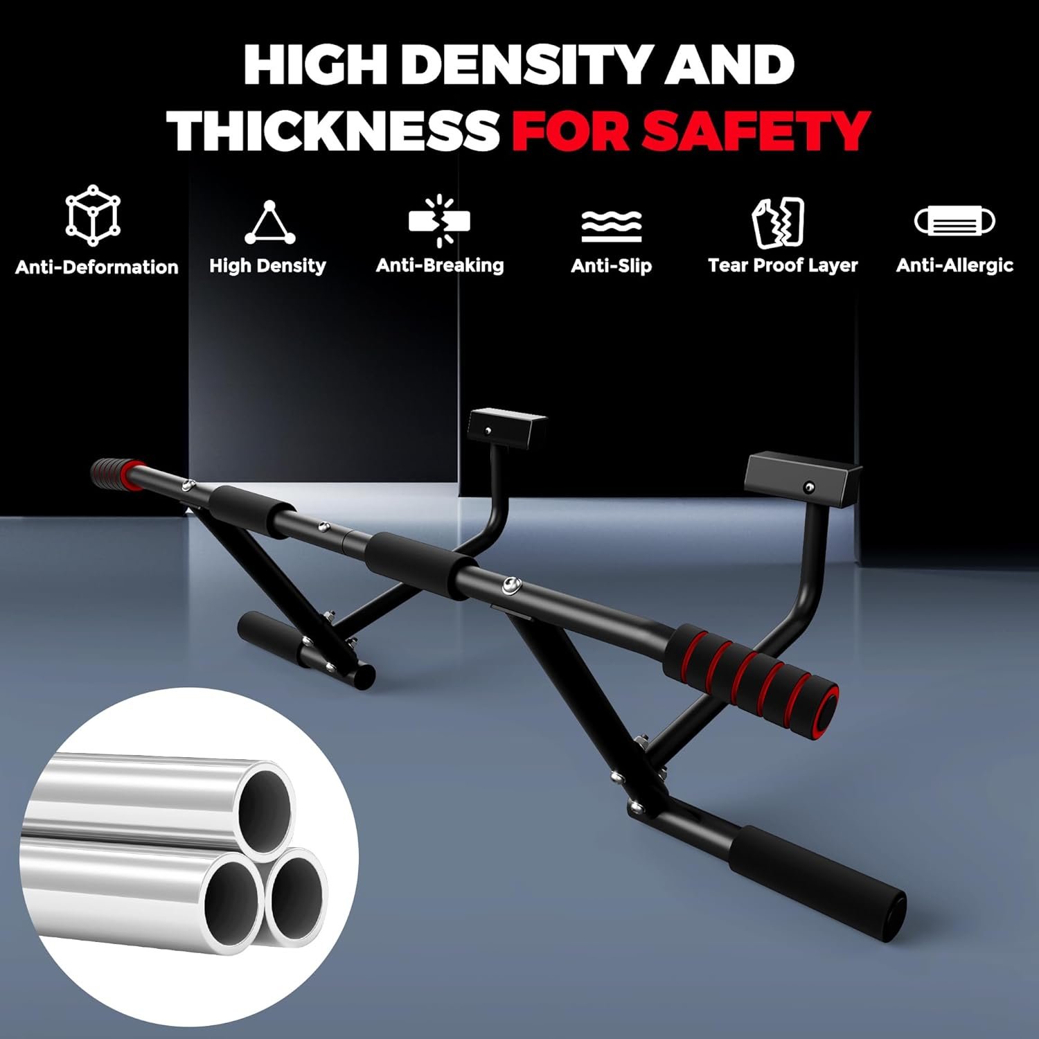 More Stability: Pull Up Bar to fit the wall and fix the door frame more firmly, making you more secure while using it. After use, there is no need to disassemble. The space left in the middle of the crossbar allows the user to enter and exit the room normally without worrying about touching the head.