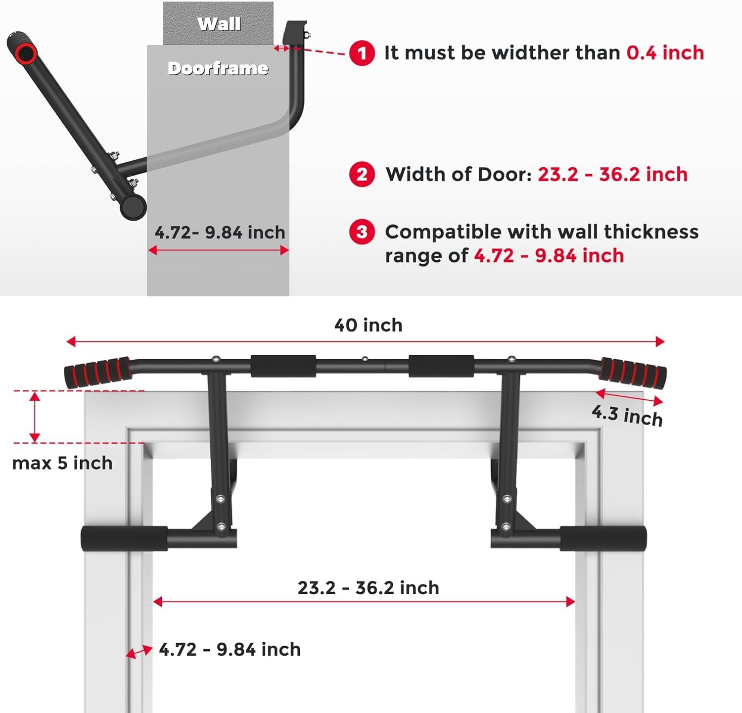 Thickened Steel: The product is made of thickened steel, and foam is installed on different grips, which is convenient for you to exercise in different ways; it can support a maximum weight of 440 pounds to ensure your safety. The full-coverage foam protector prevents damage to your door frame. The pull-up bar will not leave any marks on your door frame.