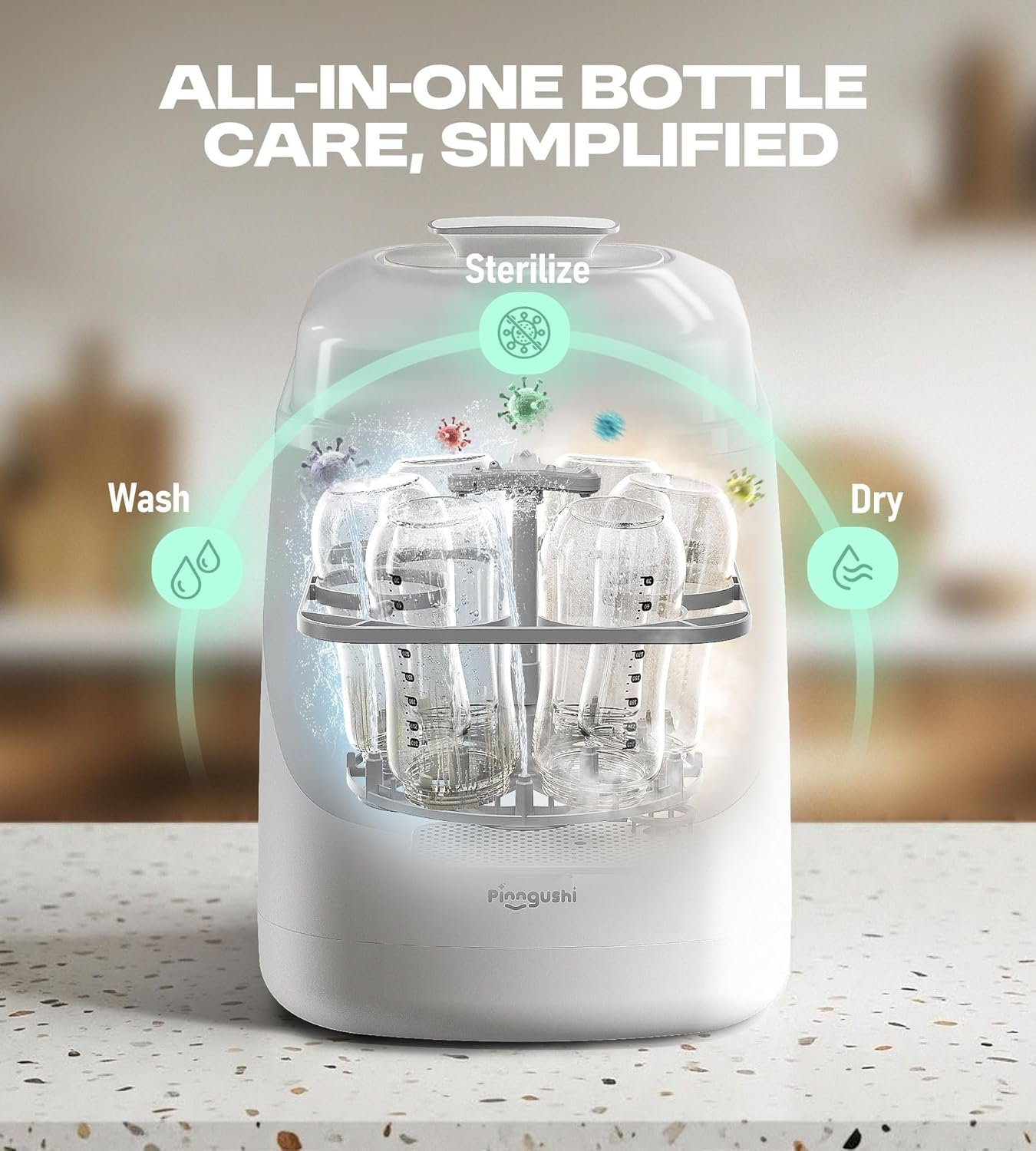 4-in-1 Fully Automatic Care: Wash–sterilize–dry–store—all in one touch. Our PINNGUSHI 4-in-1 Baby Bottle Washer Pro handles every step automatically, leaving each bottle clean, sparkling, and refreshed after every wash—making parenthood and combo feeding easier while saving you valuable time and daily effort
