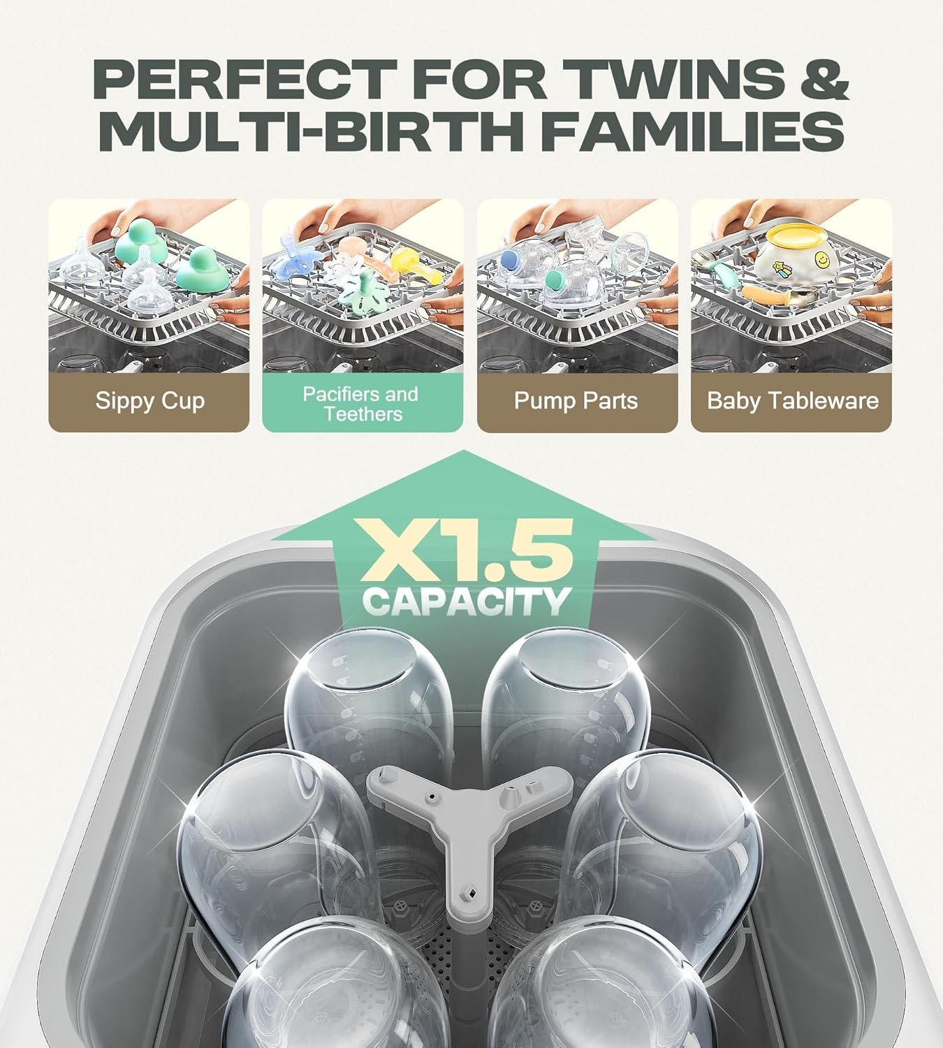 Extra Capacity for Real Life: With the PINNGUSHI baby bottle washer, you can clean up to 6 bottles at once, along with pacifiers, pump parts, utensils, or straw cups. Its spacious double-layer design fits bottles of all sizes—so you can get more done in a single cycle, saving time and effort while replacing hand washing altogether