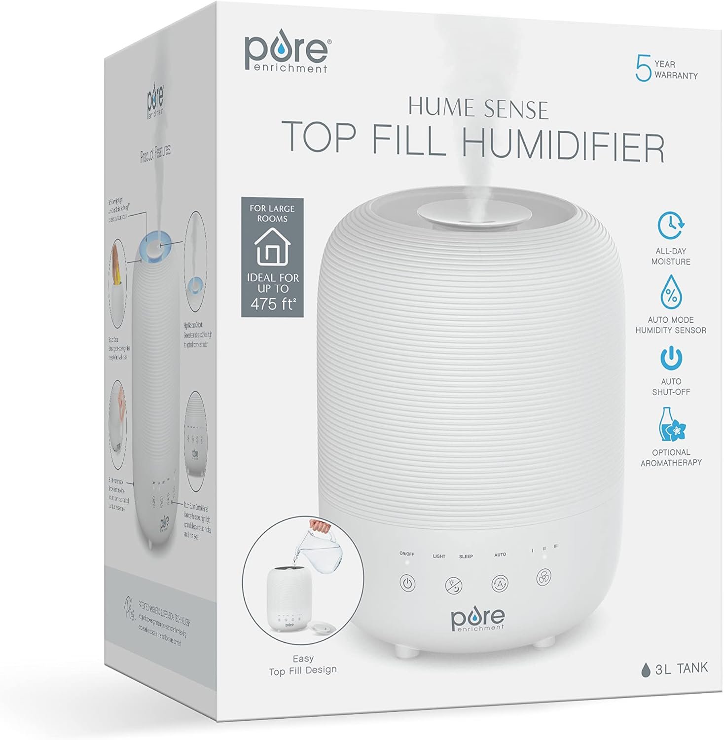 Pure Enrichment® HUME™ Sense Top Fill Humidifier – Large 3L Tank, Auto Mode Humidity Sensor, 3 Mist Settings, Optional Night Light, Optional Aromatherapy, Sleep Mode & Auto Shut-Off