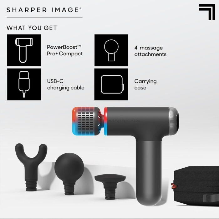 Sharper Image® Powerboost® Pro+ Hot & Cold Deep Tissue Massage Gun – 6 Speeds, 6 Attachments, 5-Hour Battery, Travel Case, Charging Base, Shoulder & Back Massager, Pain Relief Tool, Wellness Gift