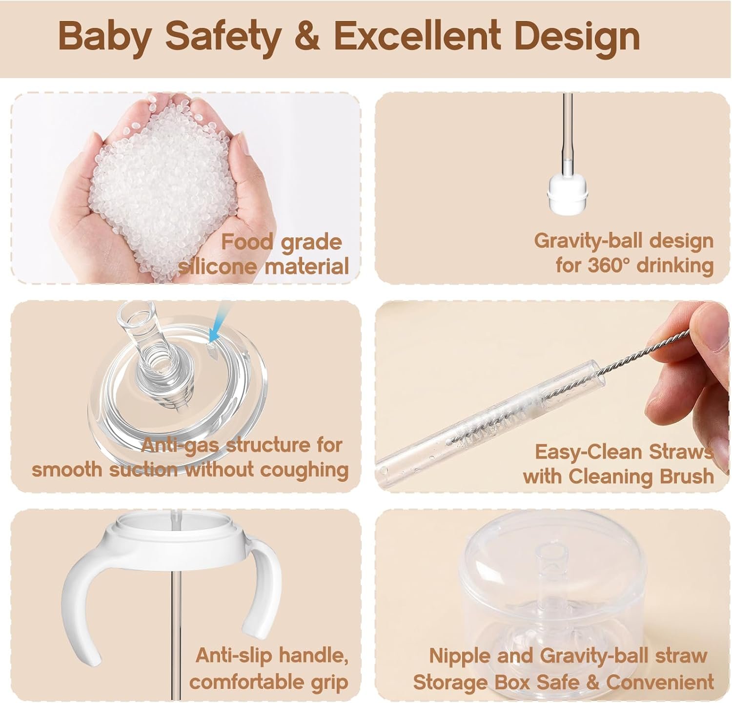 【360° Angle-Free Drinking】The gravity ball straw design allows safe drinking whether your baby is lying down, sitting, or walking. The straw length can be trimmed to fit the bottle height perfectly.