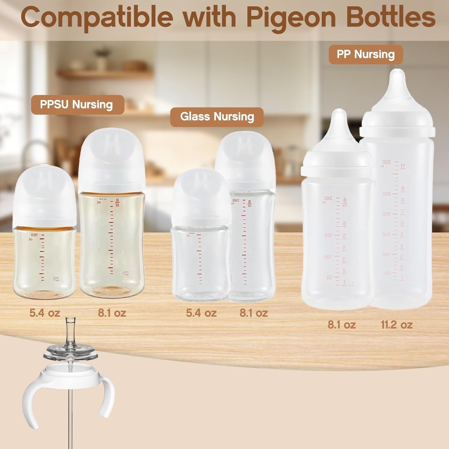 【Compatible with Pigeon Bottles】 The straw cup soft spout conversion kit is compatible with Pigeon bottles, including 4 soft silicone straw nipples, 4 weighted straws, 4 storage cases, 4 bottle handles and 4 cleaning brushes—providing all accessories needed for a complete transition from bottle to straw cup (bottles not include).