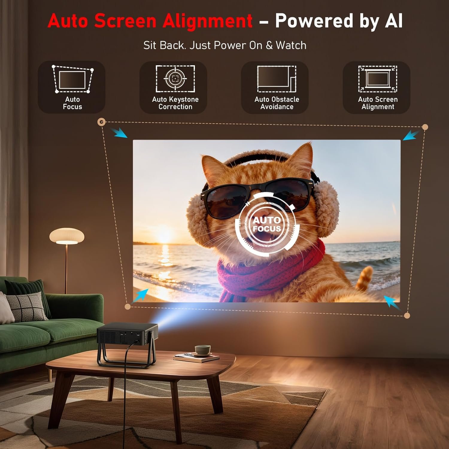 [AI Auto Focus | Auto Keystone| Auto Avoid | Auto Screen] Just power on—and let the N5 auto focus projector do all the work. N5 movie projector uses AI visual calibration to instantly adjust keystone by ±30°, delivering a perfectly rectangular image from any angle—front, rear, or ceiling-mounted. No more blurry starts—get razor-sharp focus in just 3 seconds, totally hands-free. Got furniture in the way? The Obstacle Avoidance system detects barriers in real time and automatically shifts the image to stay clean and centered. Projector with the Auto Screen Fit feature recognizes screens with black borders and resizes your projection to fit them perfectly—no stretching, no cropping, no fiddling