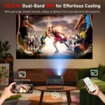 [WiFi 6 Upgrade | Seamless Screen Sharing Across All Devices] Experience blazing-fast WiFi 6 on the N5 wifi projector—delivering speeds up to 9.6 Gbps, nearly 3x faster than WiFi 5, which means smoother streaming, quicker downloads, and rock-solid connections, even in busy network environments. N5 phone projector plays nice with all your favorite devices: iPhone/iPad with AirPlay via ScreenShare. Android phones & Windows 10 laptops with Miracast via ScreenCast; Apps like YouTube that support DLNA via HomeShare; From family videos to movie nights, effortlessly cast your content from your phone, tablet, or laptop to a stunning 180-inch screen—no lag, no cables, just big-screen brilliance