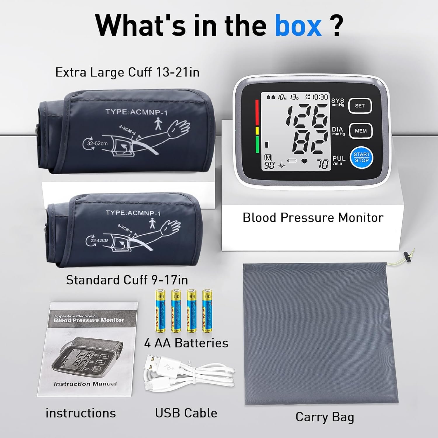 What’s in Box: 1x blood pressure monitor, 1x standard size cuff, 1x extra large cuff, 1x nylon carry bag, 1x type-c cable, 4x AA batteries, 1x user manual.